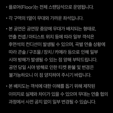 시야 방해로 인한 티켓 변경은 불가하므로, 티켓 구매 시 반드시 좌석 배치도를 참고해 주세요.