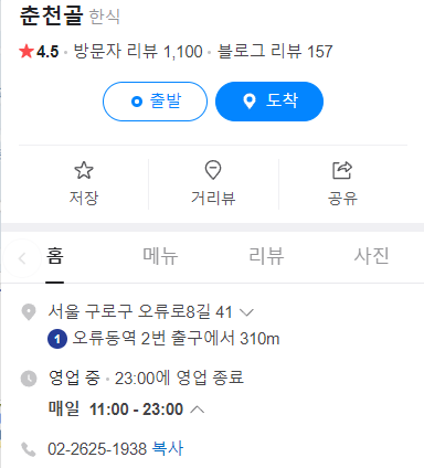 춘천골은 서울특별시 구로구 오류로8길 41에 위치하고 있으며, 매일 11:30부터 23:30까지 운영합니다. 동네 맛집이라고는 하지만, 이곳은 주차가 불가능하여 대중교통이나 인근 주차 공간을 이용하는 것이 좋습니다. 저는 동생네 아파트에 주차하고 걸어갔어요.