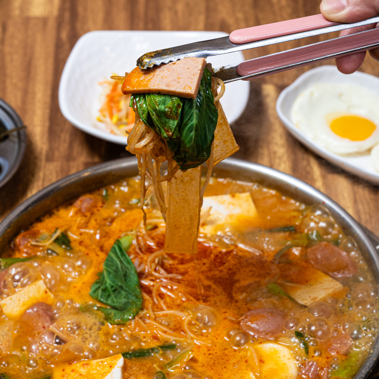 부대찌개에는 각종 햄과 소시지, 두부, 야채가 조화롭게 어우러져 한 그릇에는 다양한 맛과 영양이 담겨 있습니다. 정말 배부르고 행복한 느낌이 드는 것은 덤이죠!