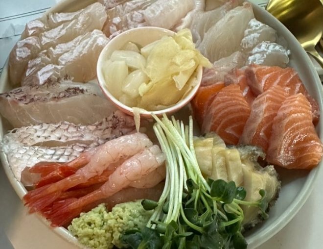 드디어 등장한 모둠 숙성회! 광어, 연어, 돔, 단새우 등 신선한 제철 회가 한 자리에 모여 있답니다.