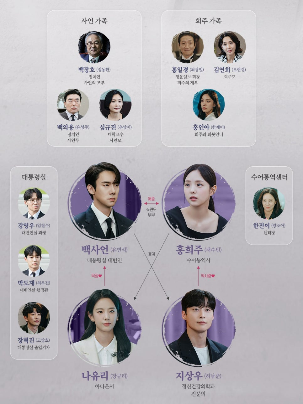 대통령실 대변인으로, 최연소 기록을 가진 엘리트. 그는 완벽한 자기관리로 논란 없이 커리어를 쌓아왔습니다. 양가의 이해관계로 얽힌 정략결혼으로 쇼윈도 부부가 되었고, 아내의 납치 사건에도 냉정한 태도를 보이는 인물입니다.
